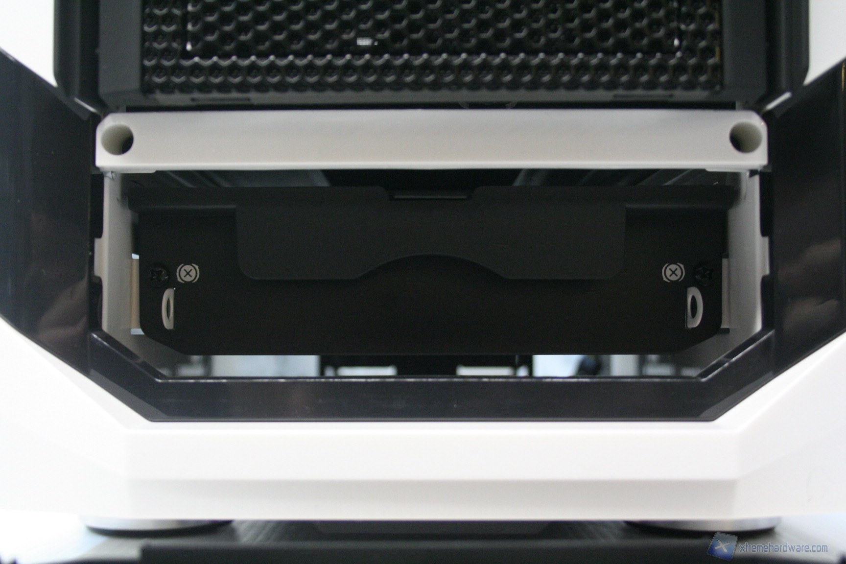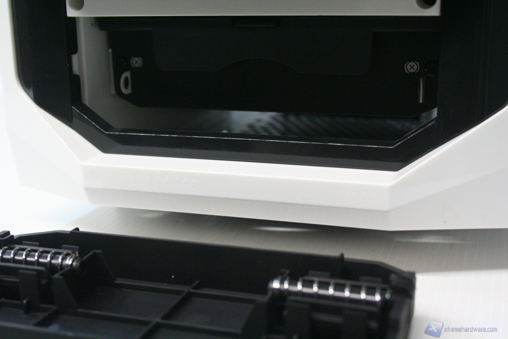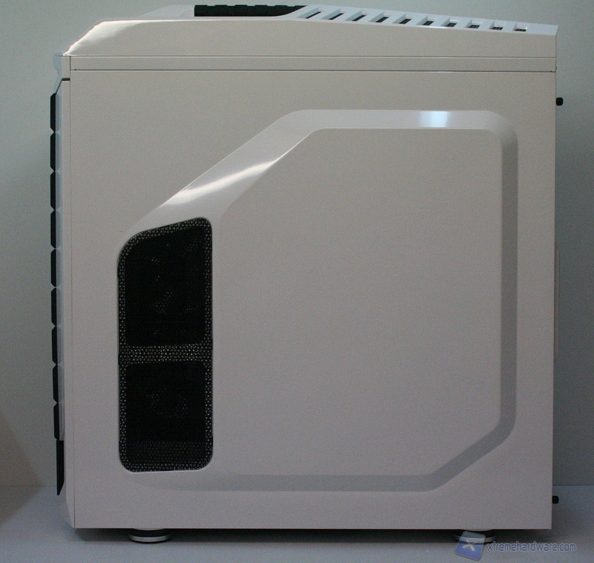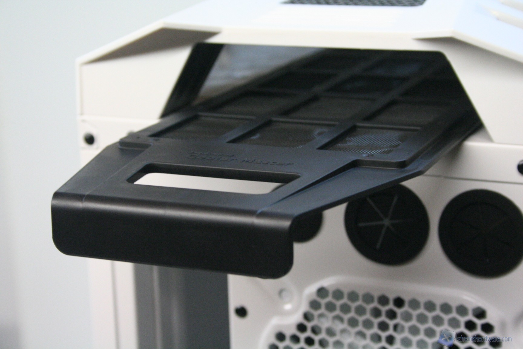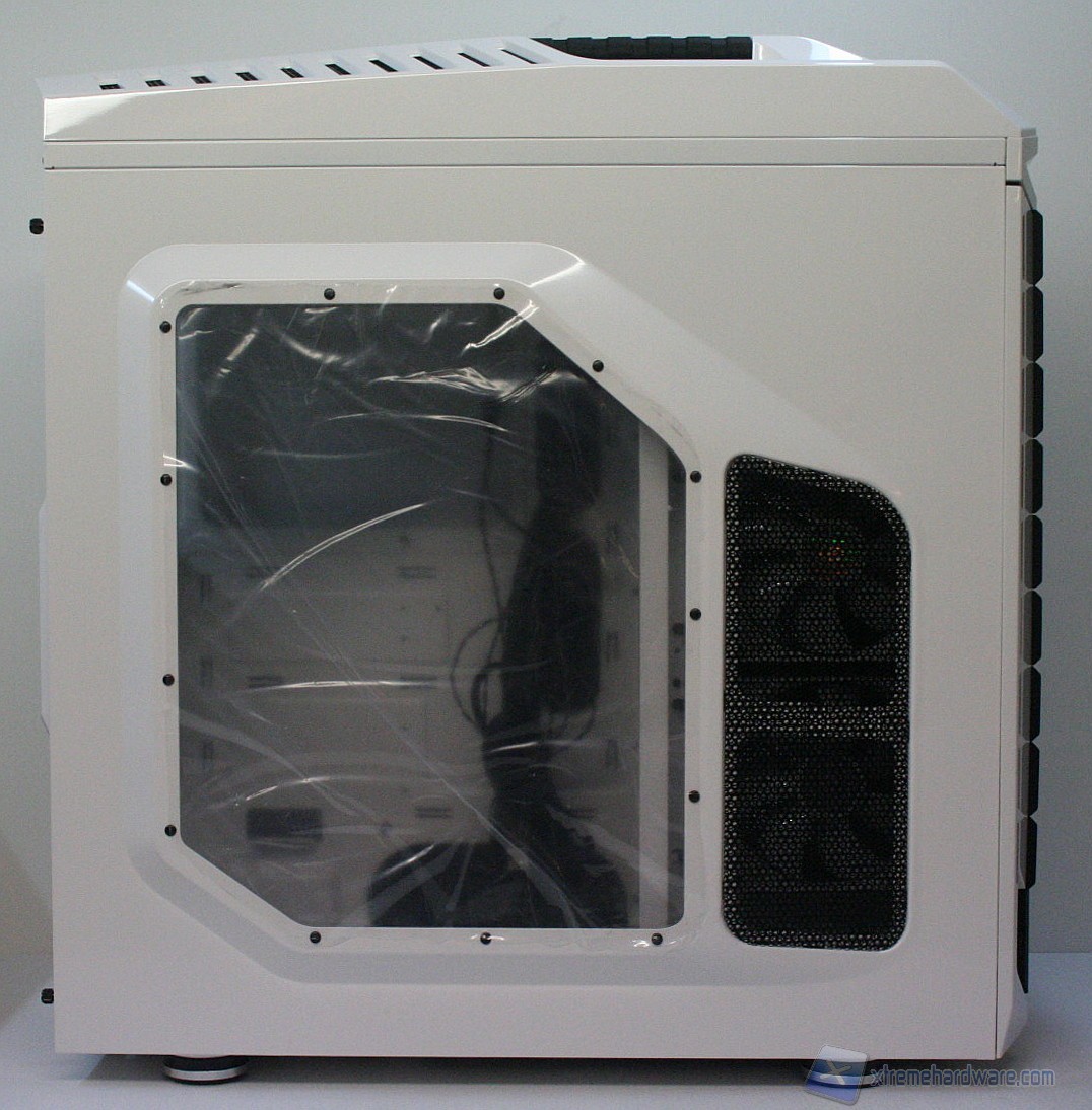 La versione che abbiamo ricevuto è l’unica in commercio quindi integralmente bianca, però con il pannello finestrato laterale. Chi desidera una colorazione scura può orientarsi sul CM Storm Trooper che ha un design del tutto simile. Il feeling immediato è di un cabinet fatto per stupire, sia per colorazione che realizzazione tecnica. L’utilizzo di acciaio SECC rende il cabinet robusto ma piuttosto pesante (13.7kg a vuoto), non troppo agevole da trasportare ad un LAN Party. Un aspetto degno di nota, similmente al modello Scout 2 CM Storm,  è l’ottima finitura della maniglia superiore, che però, pur essendo molto comoda, si trova in una posizione forse troppo frontale, che quindi non ripartisce il peso in maniera ottimale. La compatibilità con sistemi potenti è assicurata, come per impianti a liquido top di gamma. E’ possibile installare anche sistemi XL-ATX.
