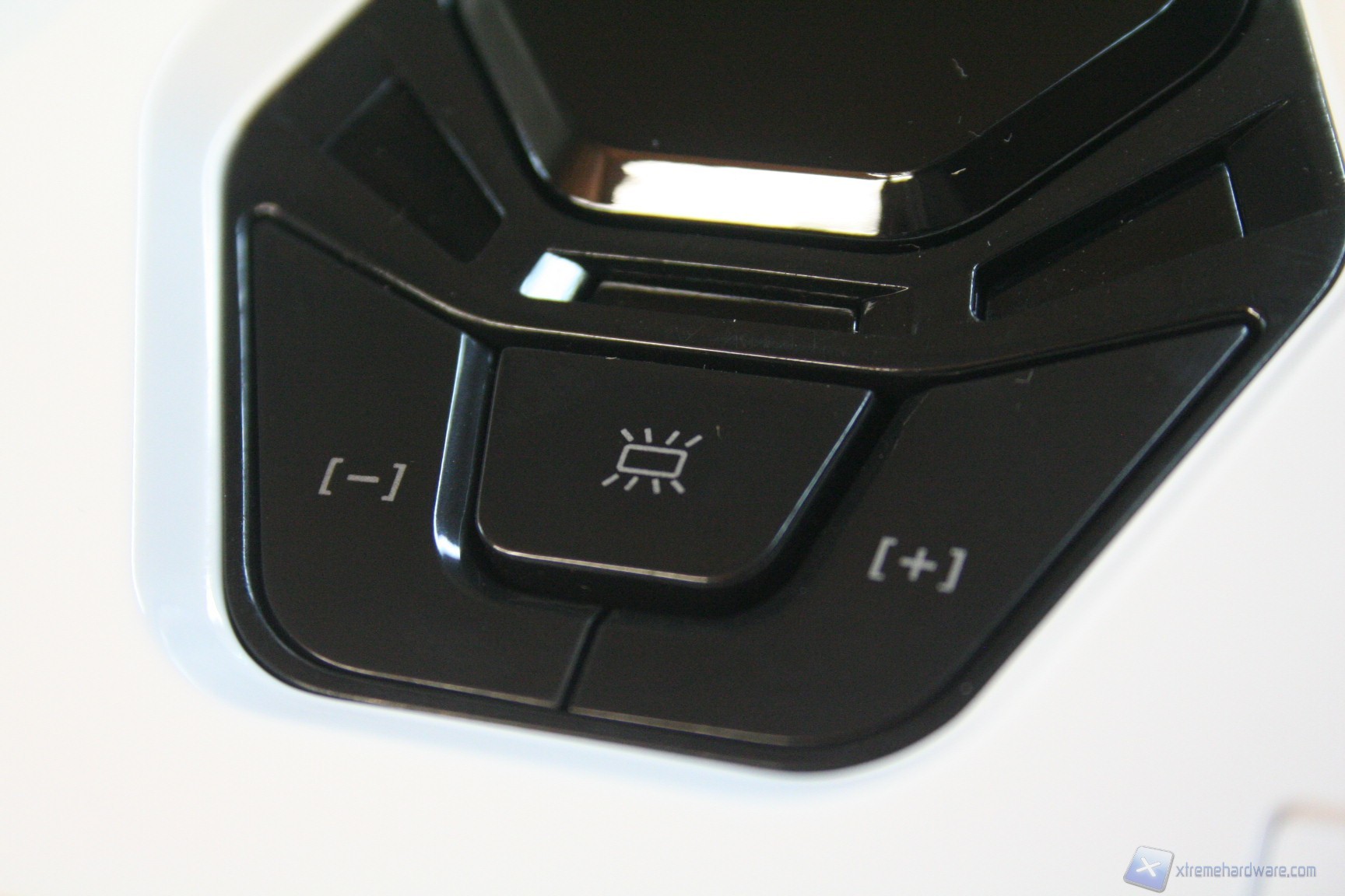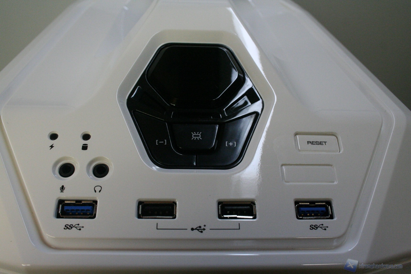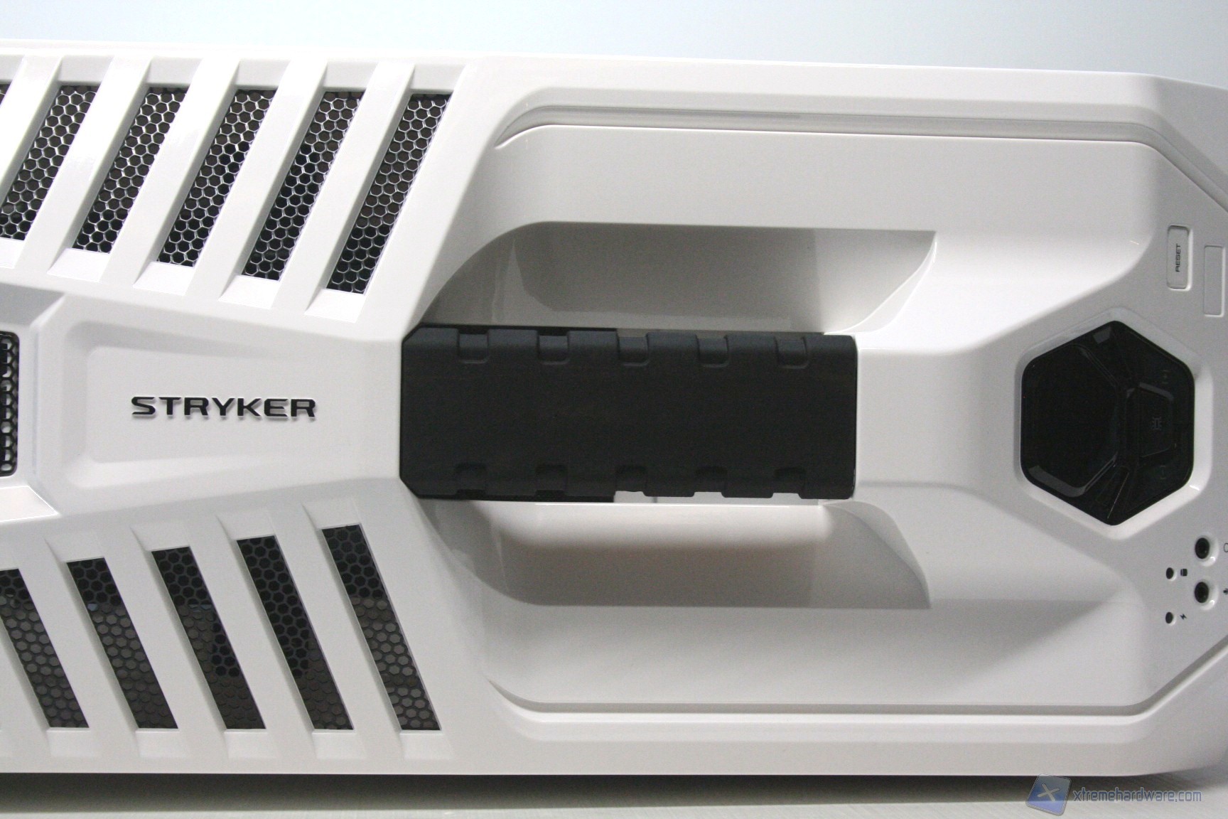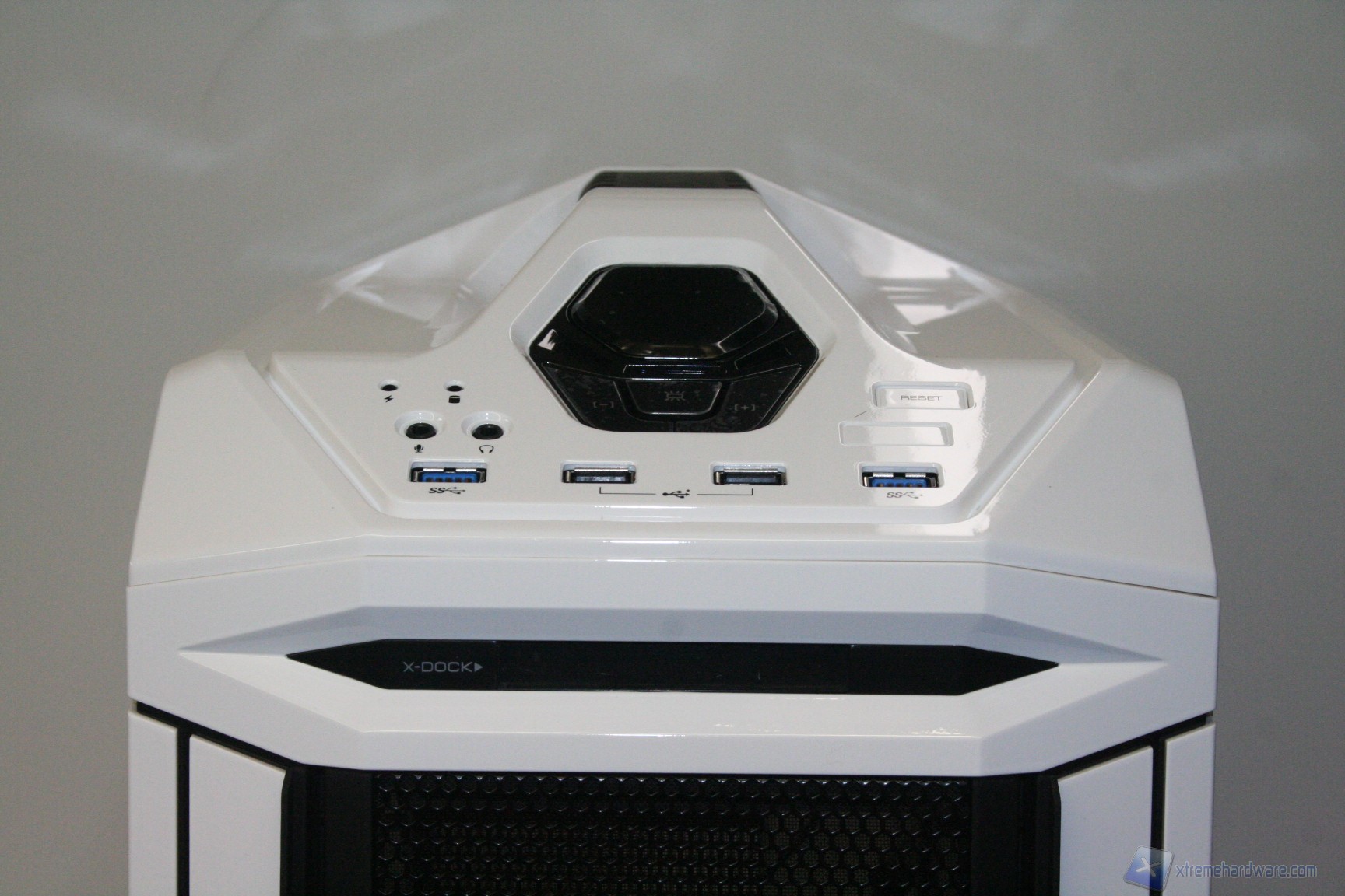 Nella parte superiore dello Stryker è presente il pannello che permette l’inserimento di due periferiche USB 3.0 e di due 2.0, assieme al microfono ed alle cuffie. Oltre a questo sono presenti ben cinque pulsanti: uno di accensione centrale, molto grande e con LED rossi, uno immediatamente sottostante per la regolazione della luminosità dei LED delle ventole frontali da 120mm, due pulsanti laterali che permettono la regolazione degli RPM e poi il pulsante di reset alla destra. Oltre a questo troviamo gli indicatori di attività per hard disk ed accensione. Facciamo presente che il comodo fan controller permette la regolazione di tutte le ventole fornite nel bundle e che è possibile selezionare 6 impostazioni di velocità diverse.