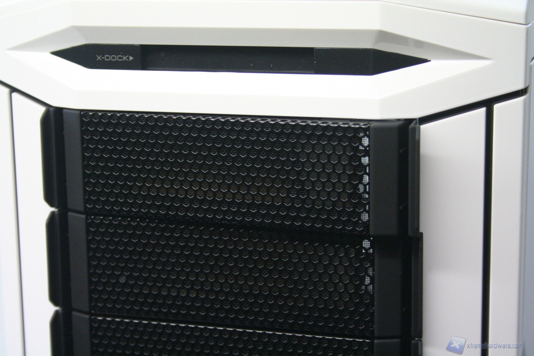 La parte frontale è caratterizzata da una struttura in plastica dura su ogni lato, mesh frontali removibili con separazione per ogni slot, una struttura removibile nella parte inferiore con il logo CM Storm (che cela un comodissimo vano per riporre oggetti e viteria dedicata) ed un praticissimo X-DOCK nella parte superiore, frontalmente, che permette l’inserimento di periferiche SATA aventi il form factor 2.5”. Sono presenti complessivamente 9 alloggi per periferiche da 5.25”, uno dei quali è convertibile a 3.5”. Al di sotto della griglia sarà possibile installare fino a due ventole da 120mm. Queste risultano già presenti, anche se sono posizionate lateralmente invece che frontalmente (esamineremo dopo la questione nel dettaglio). La griglia mesh funge inoltre da filtro per limitare l’ingresso della polvere.