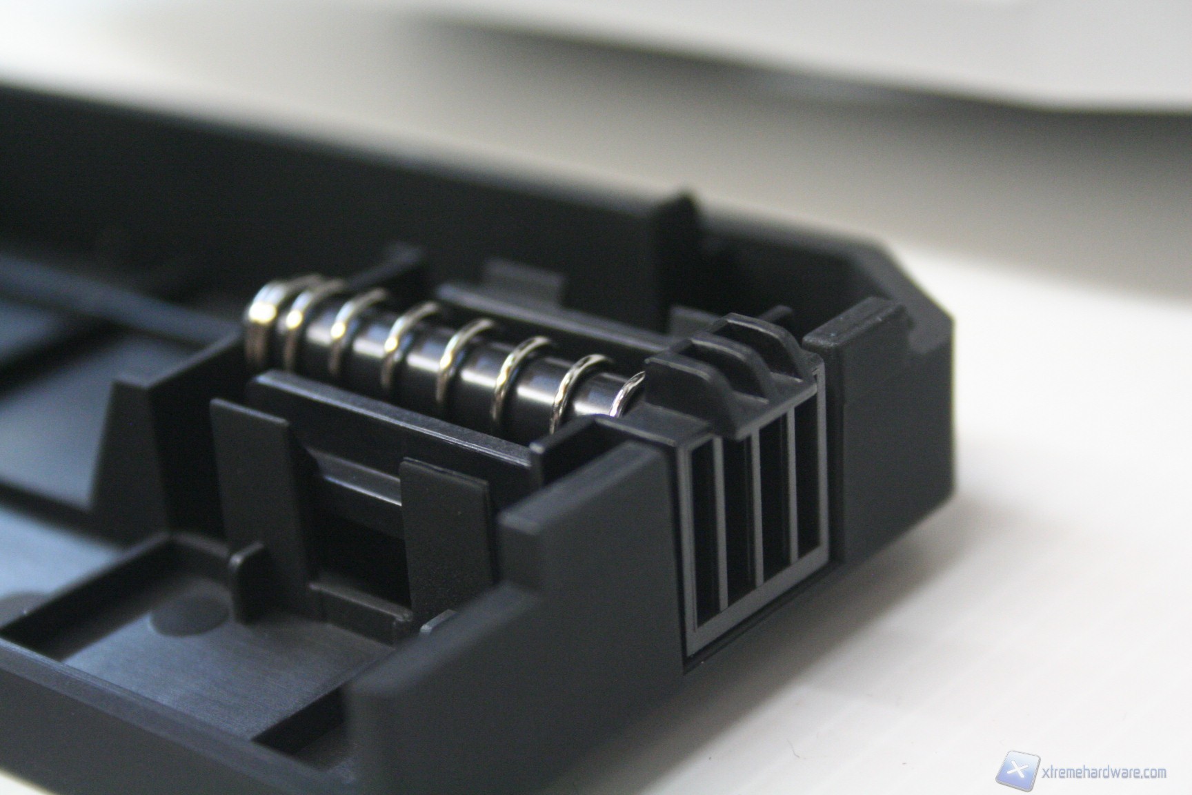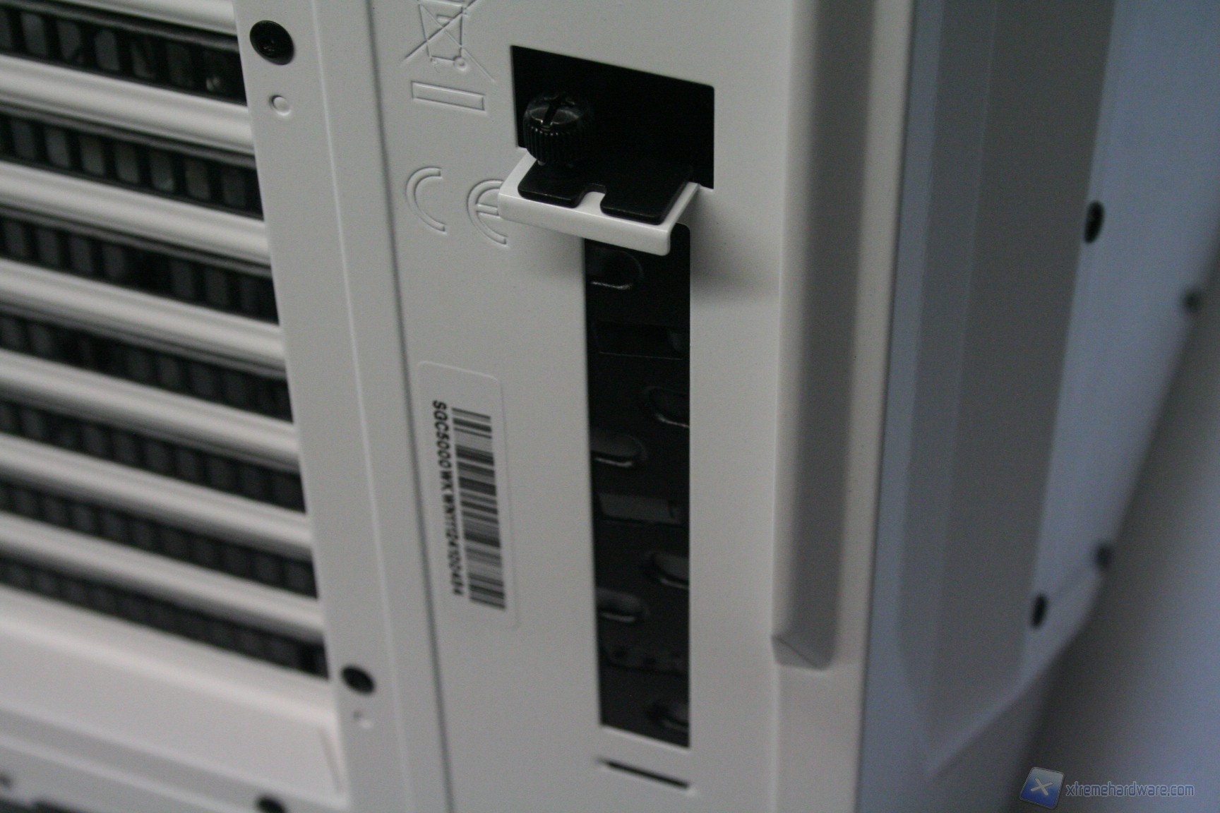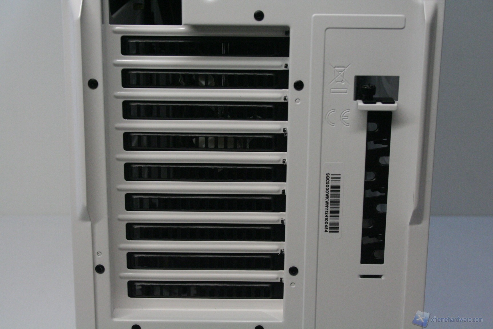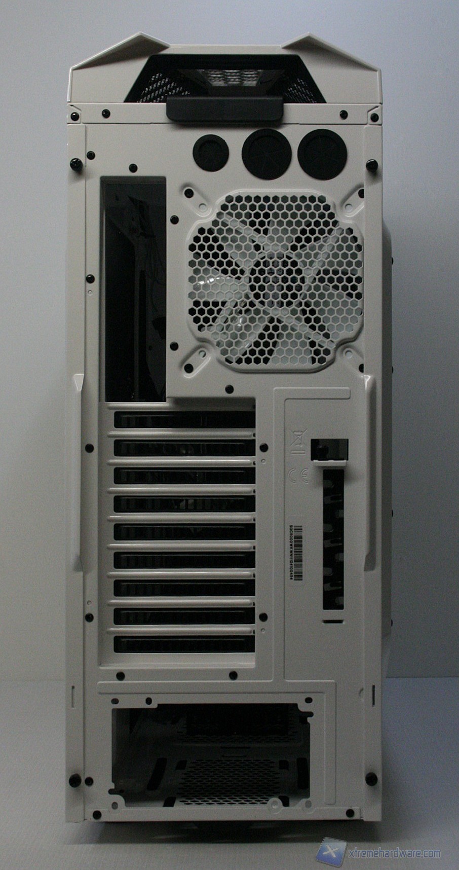 Posteriormente abbiamo una configurazione classica ma leggermente potenziata, con alimentatore nella parte inferiore, 9 slot di espansione PCI che presentano aperture d’aerazione, tre fessure per l’installazione di tubazioni a liquido nella parte superiore, la predisposizione per una ventola da 120/140mm (140 preinstallata) ed infine è presente un sistema laterale di passaggio e bloccaggio dei cavi, che permette di non far rimuovere periferiche dall’esterno. Tale sistema, posizionato accanto agli slot PCI è denominato “Storm Guard” ed è particolarmente utile durante i LAN Party poiché impedisce il furto di periferiche quali mouse, tastiera ed headset. Utilizzando tale accorgimento, sarà necessario aprire il pannello laterale per poter estrarre il connettore dal cabinet. Lo spessore del cabinet in questa zona è elevato e la presenza di una bombatura nella paratia laterale sinistra facilita l’installazione di dissipatori voluminosi.