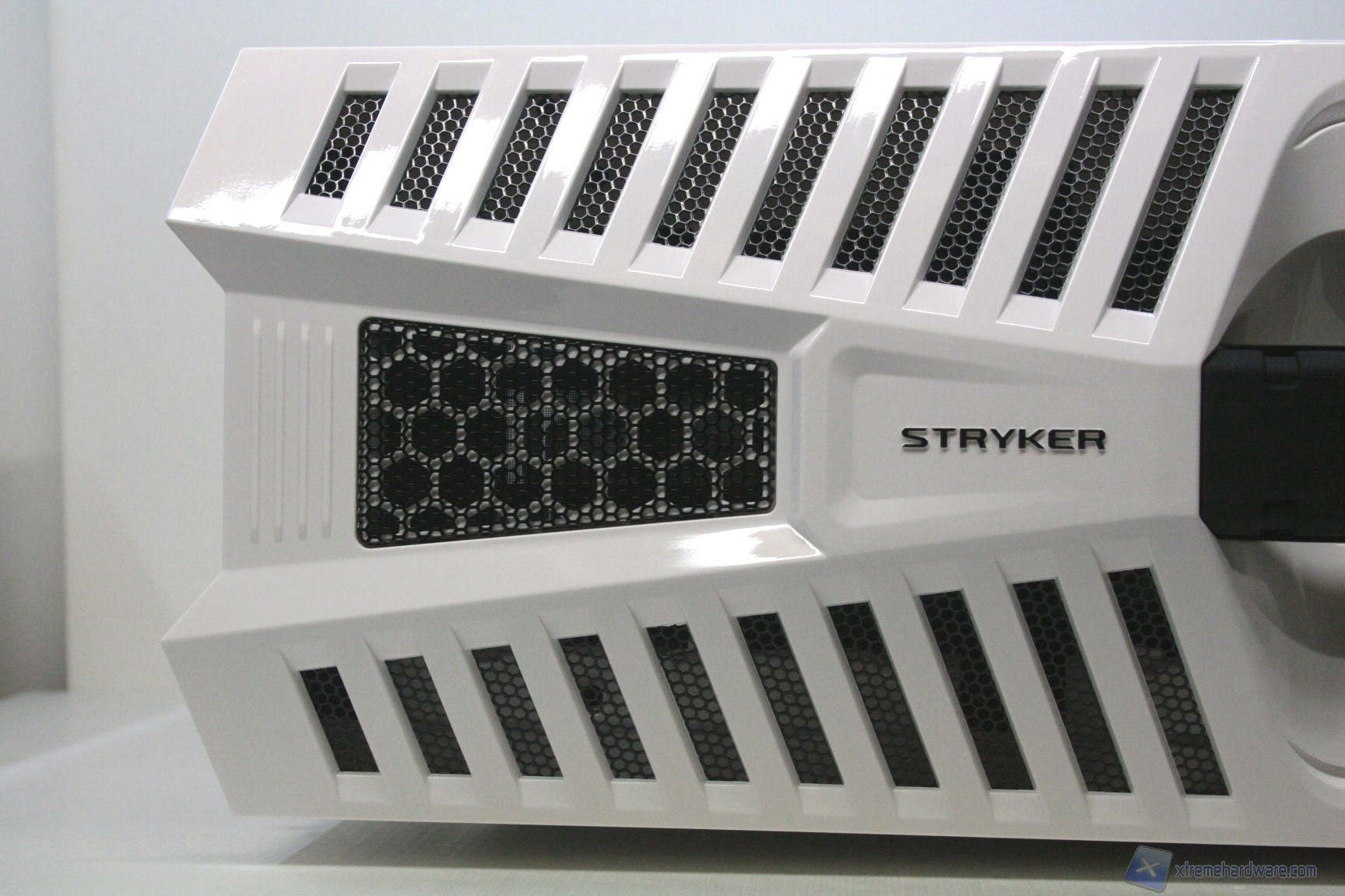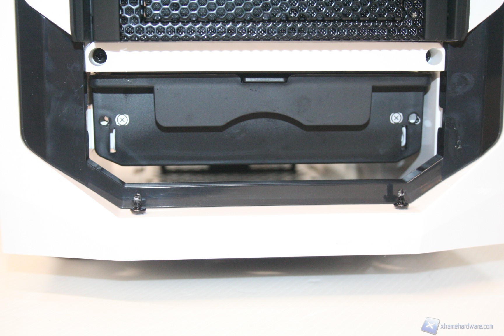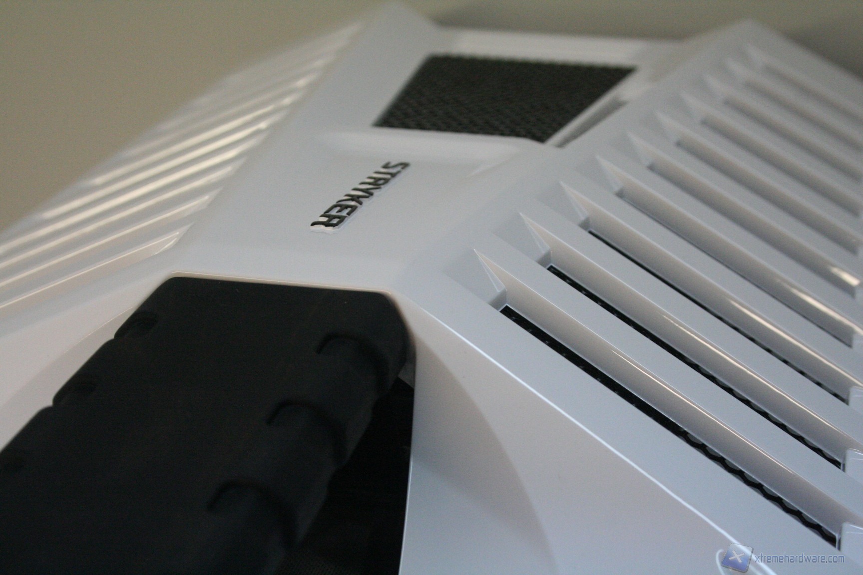 Lo Stryker nella parte inferiore presenta una configurazione classica, con un filtro antipolvere sotto alla feritoia di immissione dell’alimentatore, estraibile dall’esterno. E’ presente una seconda apertura per l’installazione di due ventole da 120mm nella parte bassa del cabinet, provviste di filtro, removibile dalla parte frontale. Sul fondo del cabinet troviamo inoltre i 4 classici piedini di appoggio, con funzione di assorbimento delle vibrazioni. Non è possibile montare delle classiche ruote per lo spostamento del cabinet.