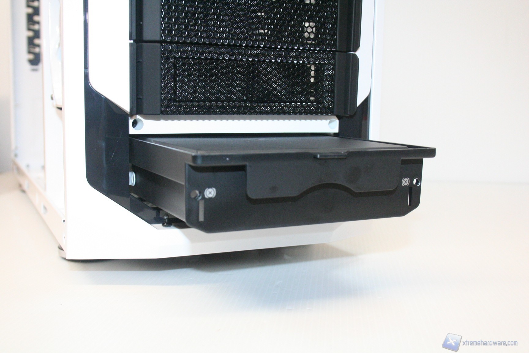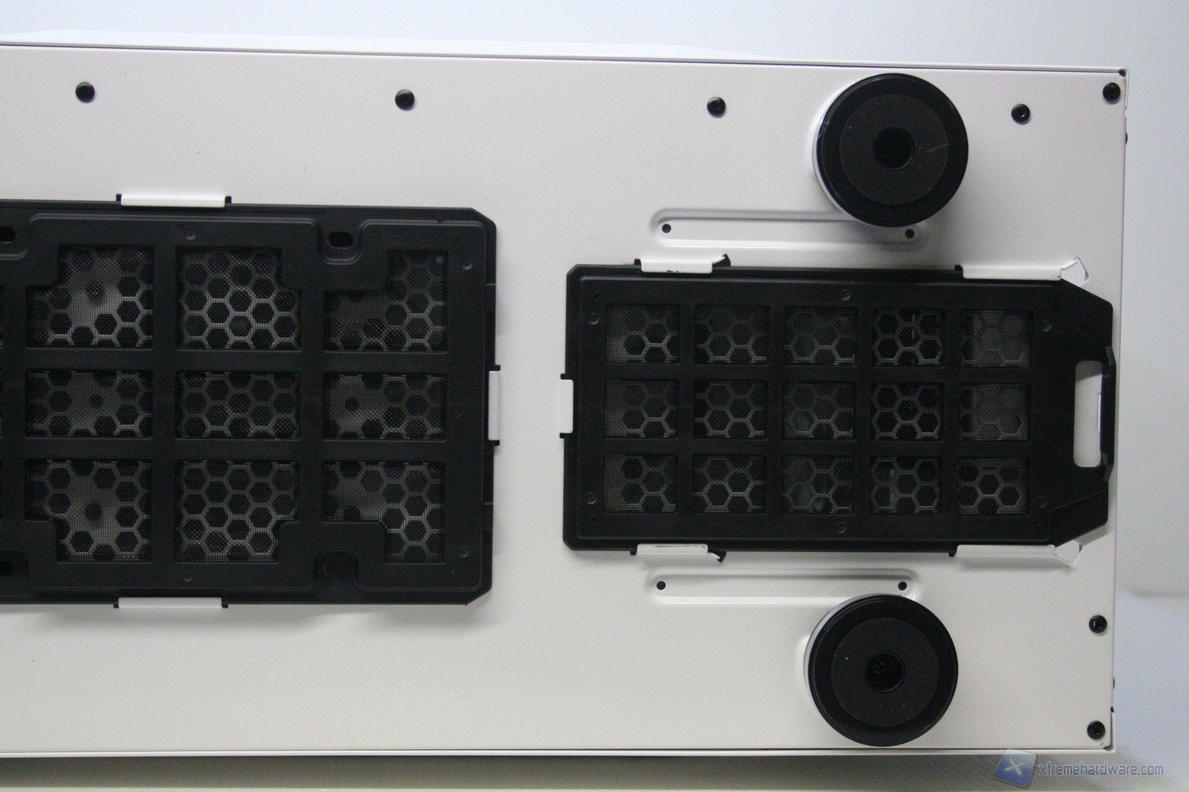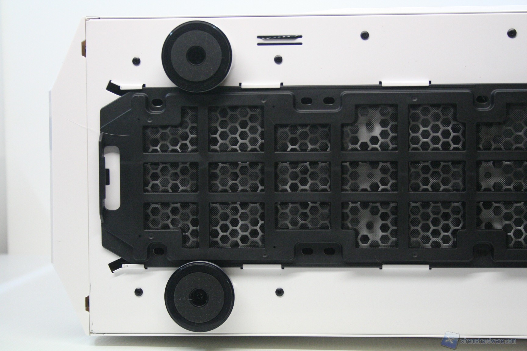 Lo Stryker nella parte inferiore presenta una configurazione classica, con un filtro antipolvere sotto alla feritoia di immissione dell’alimentatore, estraibile dall’esterno. E’ presente una seconda apertura per l’installazione di due ventole da 120mm nella parte bassa del cabinet, provviste di filtro, removibile dalla parte frontale. Sul fondo del cabinet troviamo inoltre i 4 classici piedini di appoggio, con funzione di assorbimento delle vibrazioni. Non è possibile montare delle classiche ruote per lo spostamento del cabinet.