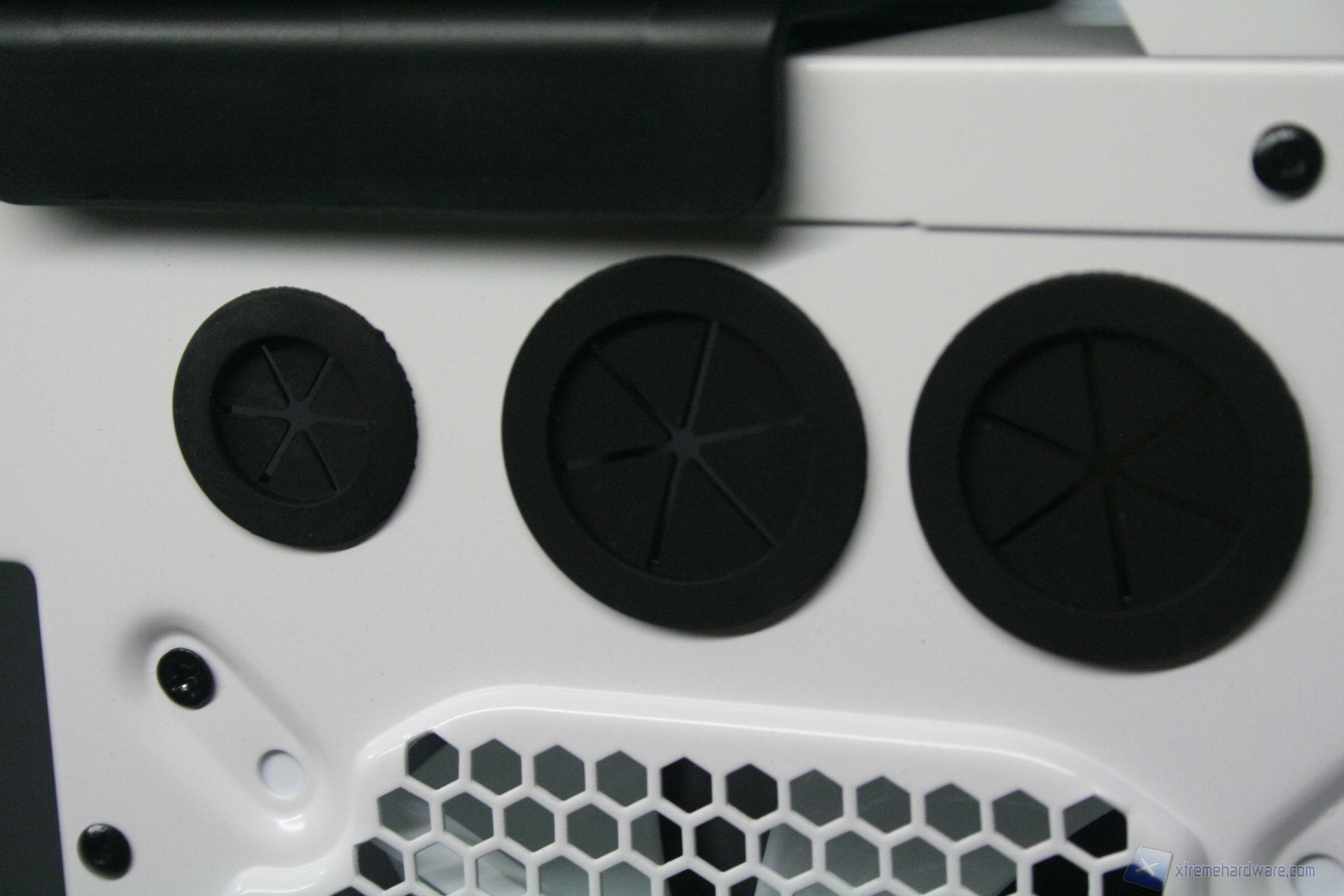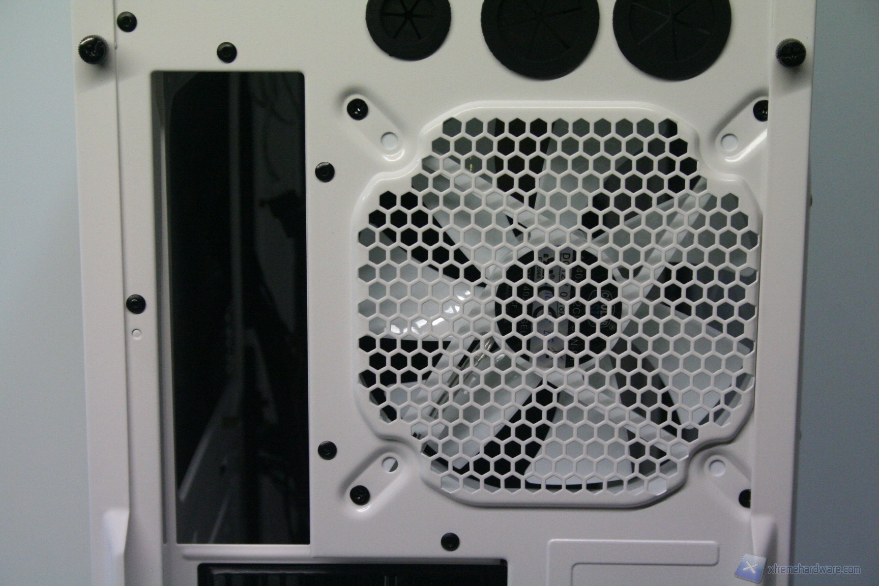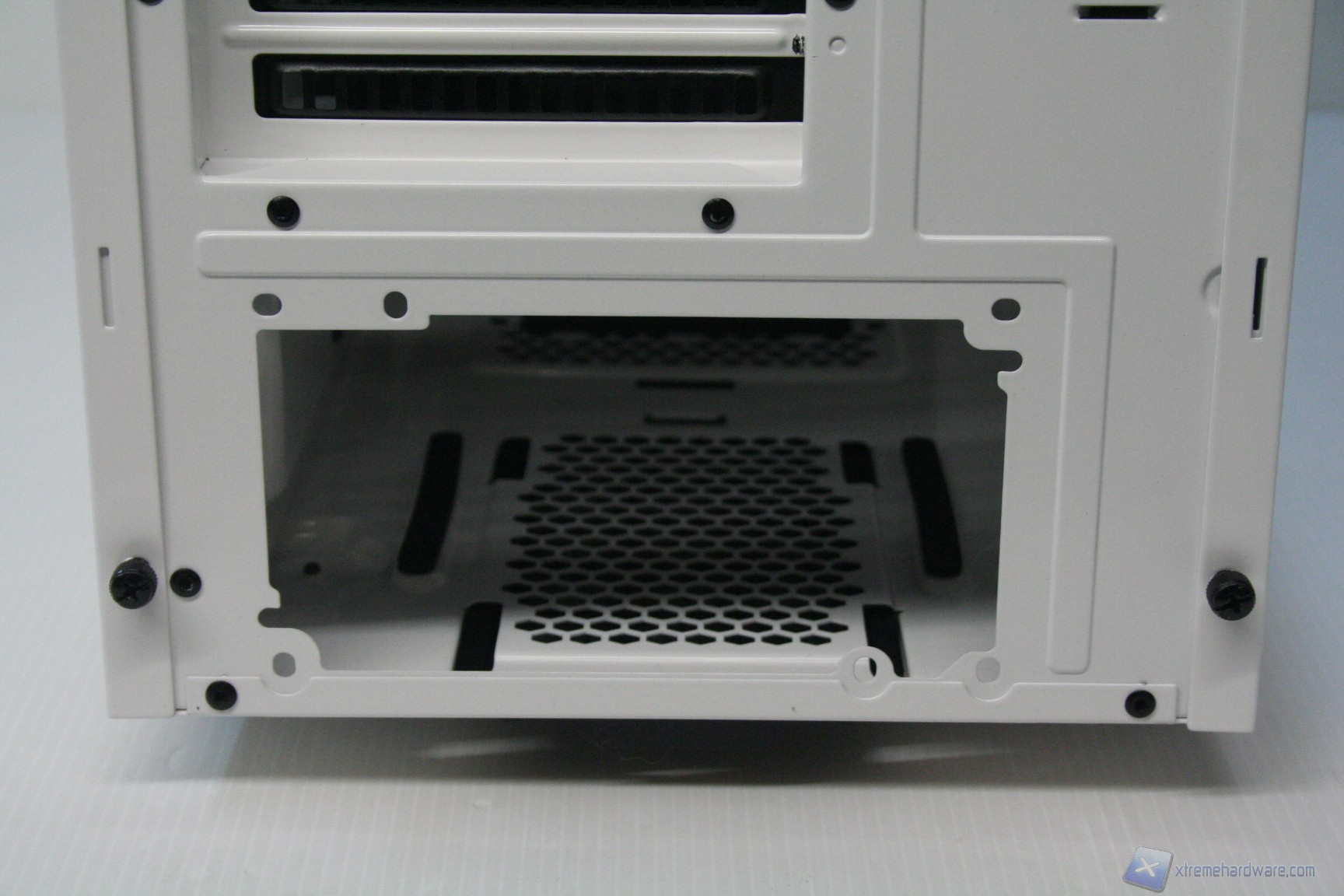 In questo caso si è scelto di utilizzare slot PCI perforati, che però potrebbe portare al fenomeno del “negative loop” orizzontale, tale per cui le temperature della scheda grafica possono aumentare a causa del potenziale ricircolo di aria calda dall’esterno. Questo fenomeno potrebbe verificarsi qualora ci fosse una pressione negativa all’interno (ovvero sbilanciamento tra ventole in estrazione e in immissione, in favore delle prime), leggermente presente nella configurazione di default. La presenza dell’alimentatore nella parte inferiore potrebbe ulteriormente incrementare tale fenomeno. Fortunatamente, data l’elevata configurabilità e l’elevato numero di ventole potenzialmente installabili, si può migliorare notevolmente l’aerazione del cabinet ed in particolar modo del comparto grafico, specialmente con l’installazione di due ventole da 120mm nella parte inferiore, assieme alla rotazione dei cage degli hard disk di 90 gradi, con le ventole rivolte in immissione frontalmente.