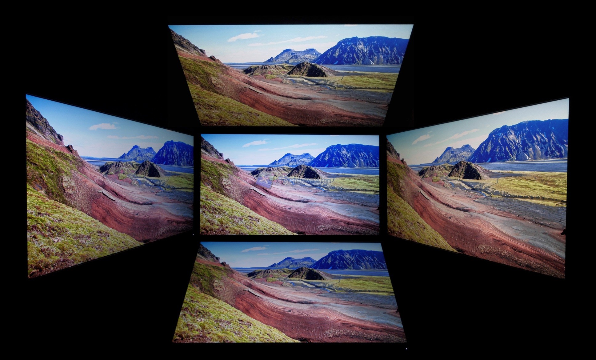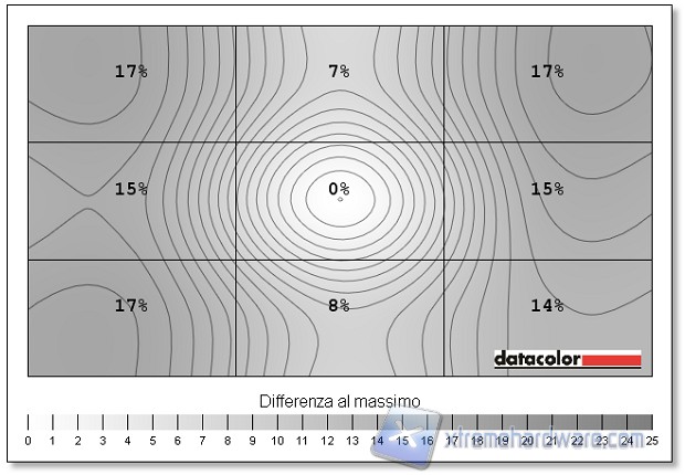 In questo test andiamo a valutare la deviazione colorimetrica all’aumentare dell’angolo di visione per i quattro lati. In questo test prevalgono in genere i display a matrice IPS / PLS / AHVA; seguono i VA e infine i TN. Trattandosi di un pannello AHVA i risultati sono piuttosto buoni, ma forse un poco sotto la media dei migliori.