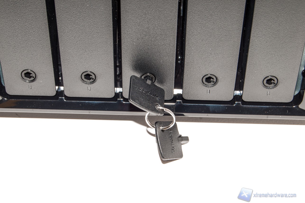 La parte frontale presenta i cinque bay disposti orizzontalmente, dotati di LED di segnalazione dello status di funzionamento di ogni singolo disco e di chiavetta per il serraggio degli stessi.